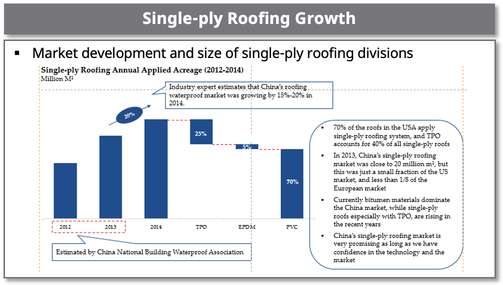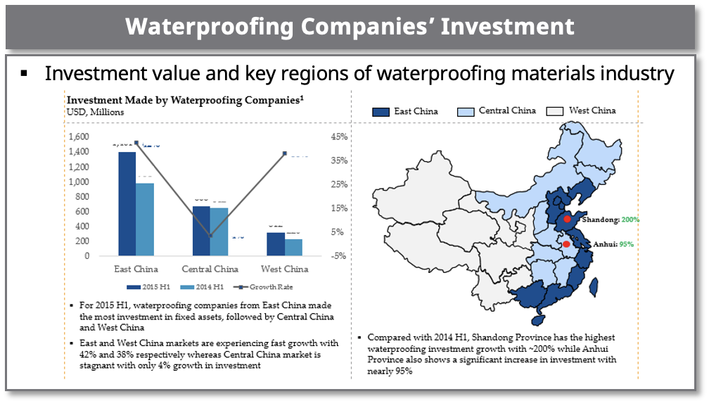 - Identified market size, market growth and market share of China’s waterproofing materials market