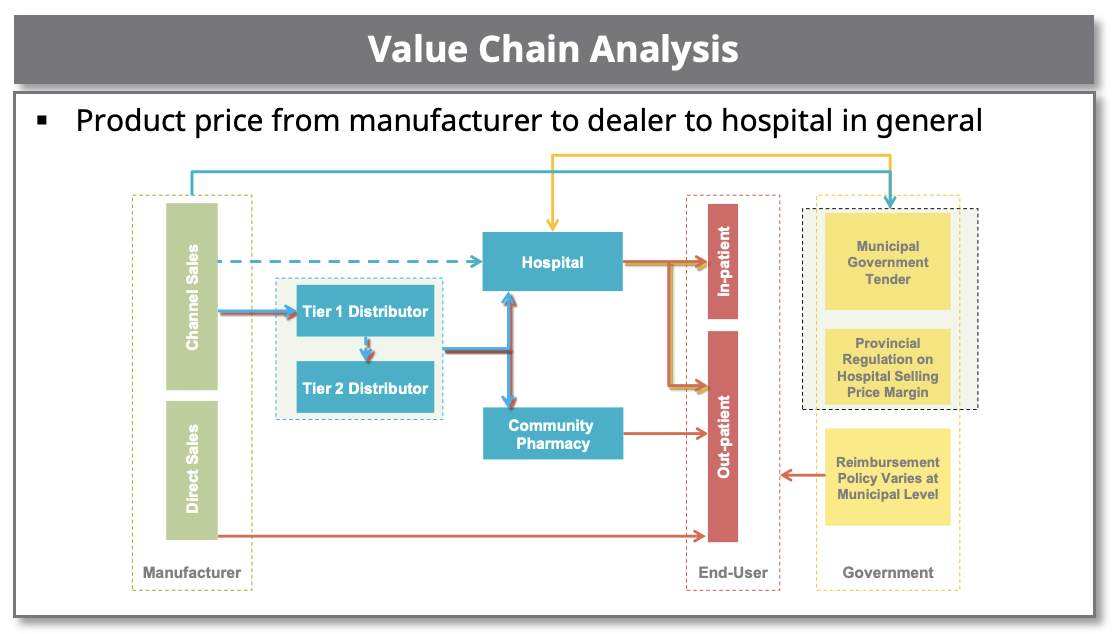 • Established a detailed value chain map for two medical consumable categories